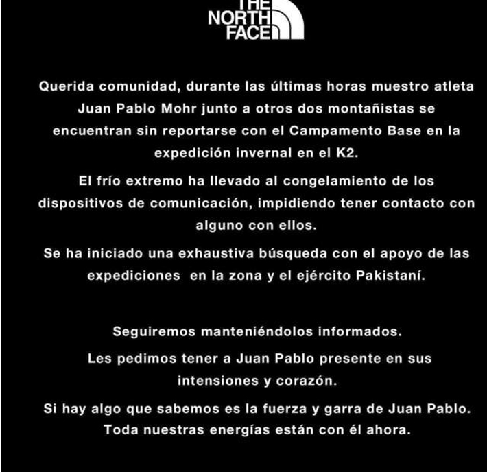 Comenzó la búsqueda y helicópteros subieron más de 7 mil metros, aún sin noticias de los montañistas. A mediados de enero, Sergi Mingote, compañero de expedición del nacional, falleció en el K2 debido a una caída. Tras el triste acontecimiento, Mohr decidió continuar en honor al español. Tamara Lunger, italiana compañera de Mohr, abandonó su ascenso y ya regresó a la base. Publicó en redes sociales que está físicamente bien, pero triste por no tener noticias de sus compañeros. The North Face, una de las marcas que patrocina a Mohr, confirmó la noticia en un comunicado. Mohr ha hecho una carrera brillante. Tiene un récord Guinness por lograr ascender en dos de las cumbres más altas del mundo y ya ha conquistado cinco «ochomiles».