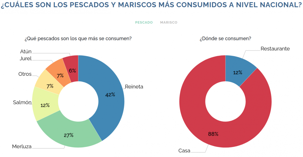 Algunos de los resultados obtenidos revelan que, en promedio, en Chile se consumen 3,6 veces al mes pescado y mariscos 2,3 veces al mes. Además, el estudio devela que el 90% del consumo de productos marinos se realiza en el hogar y que el pescado más consumido a nivel nacional es la reineta (41,5%) y la merluza (27%), mientras que el marisco más común, es el chorito (33,5%).